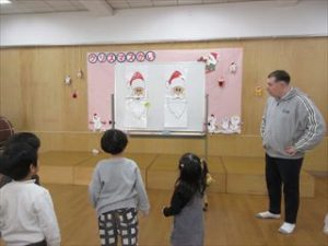 先日、ベンジャミン先生と一緒に英語で遊びました。 もうすぐクリスマスということで、クリスマスにちなんだ遊びをしました。 初めはサンタクロースの口(マウス)をねらってボールを投げて遊びました。 子どもたちはよくねらってボールを投げ「やった!入った!」と喜んだり、「ヘッドだった~」と当たったところを英語で話したりしてました。 また、サンタクロースとトナカイがソリに乗っているパズルをしました。 ベンジャミン先生が英語で話す数字を聞いて、順番に絵を貼っていくと・・・ 「できた!」「ソリで空を飛んでる!」と完成した絵を友達や教師と見せ合っていました。 今年のベンジャミン先生との英語の時間は最後の日だったため「メリークリスマス!」「よいお年をお迎えください!」と元気に挨拶をしました。 3学期も英語に触れて遊ぶ楽しさを感じられるようにしたいと思います。