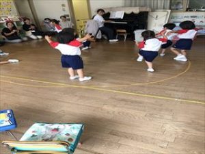 年少組は、園庭でかけっこをしたり、体操や律動をしたりして遊びました。