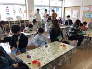 今日は「防災バッグをつくろう」がテーマで、講師は本学のこども教育学科教授の田中先生と深川先生でした。