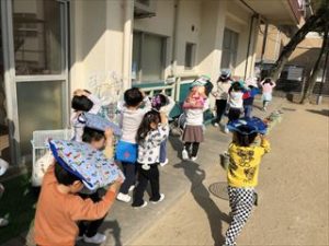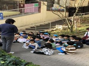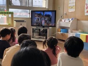 前日に、園長先生から阪神淡路大震災が起こった時の話を聞いたり、「こんな時どうするの?」というDVDを見たりした子どもたち。