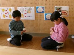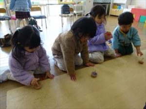 年少児は手回しコマ、年中児は糸引きコマで遊んでいます。