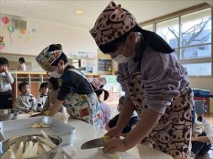 みそ汁に入れる大根や薄上げは、年長児が切りました。