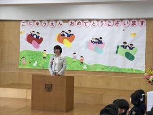 入園式では、園長先生、理事長のお話を聞いたり、幼稚園の先生の紹介を聞いたりしました。